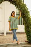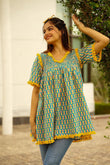 Turquoise Embroidered Printed Lisa Cotton Kurta Top