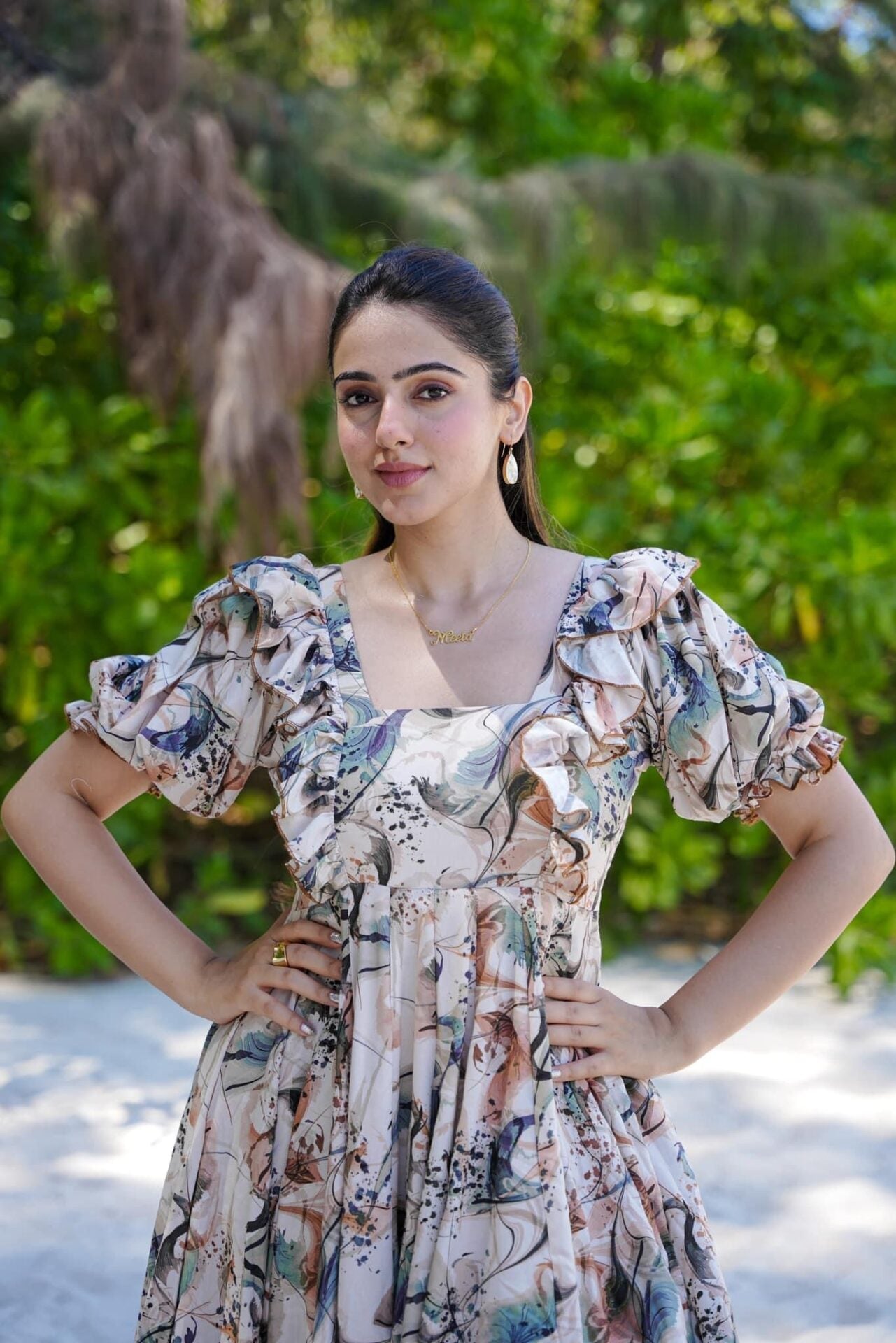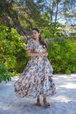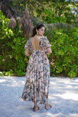 Beige Designer Pearl Frill Delight Below Knee Maxi Gown Dress