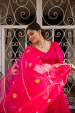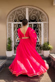 Stand apart your look this season wearing our pink organza 30 kali lehenga matched up with an organza choli grasped with puff sleeves and a long wonderful dupatta giving it a moderate look.