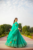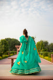 Curated with total flawlessness, this organza green lehenga will catch your hearts with its customary butterfly tie-knot back pattern. The flare that makes it exceptionally engaging just as will help in giving a complimenting silhouette. Makes you look in vogue at any event. Pair this up with exquisite earrings to finish the look.